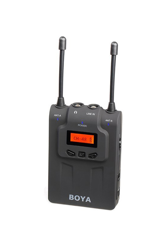Digitalni bežični prijemnik • UHF prijemnik sa 48 kanala • Dvo-kanalni prijemnik • Bežično se sinhronizuje sa predajnikom za jednostavno podešavanje • OLED ekran • Podesivi MONO i stereo mod • Radni opseg može dostići i do 100m • Pokreću dve AA baterije. • Uključuje audio kabl od 3,5 mm. • Uključuje držač za cipele Boya BY-RX8 Pro je dodatni prijemnik za bubice Boya BY-WM8.