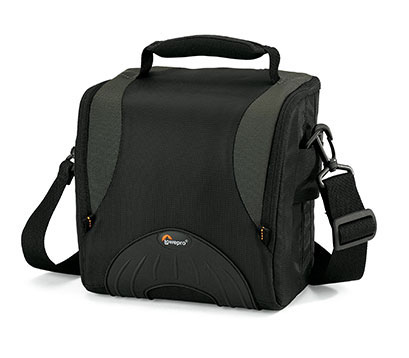 Torbica za DSLR fotoaparat sa nakačenim objektivom i još jedan dodatni objektiv ili blic, kao i druge sitnice.